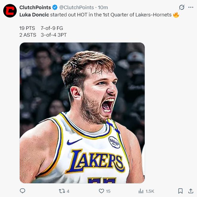 第二节东契奇登场三分不中后对迪亚巴特犯规,东契奇又冲着裁判喋喋不休,这一节东契奇6分钟里1中0没有得分,半场打完还是19分,也因为东契奇的沉寂湖人单节16-34直接崩盘。湖人从领先9分到落后9分实在是太过于迅猛。