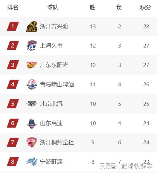 积分榜第6名则属于山东队,最近山东队状态火爆,截止到目前,他们已经豪取8连胜,球队的战绩也变成10胜4负。不过,由于少赛一轮的缘故,山东队的排名稍微吃亏,暂时排在积分榜第6名。而排在第7名的是浙江队,他们的战绩是9胜6负。积分榜第8名则属于宁波队,作为本赛季的黑马之一,宁波队目前已经拿到了8胜7负的战绩,暂居积分榜第8名,这与他们上赛季的表现比起来,已经提升了不止一个档次。