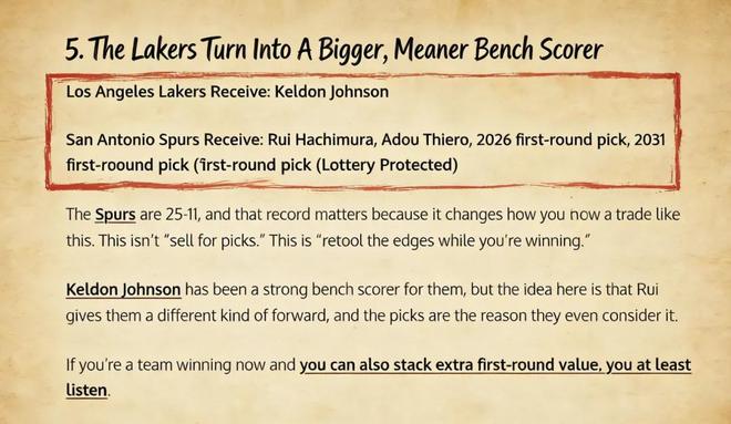 美媒《Fadeaway World》撰文建议,湖人可以将蒂耶罗、八村垒、2026年及2031年首轮签打包送到马刺,换回凯尔登。
