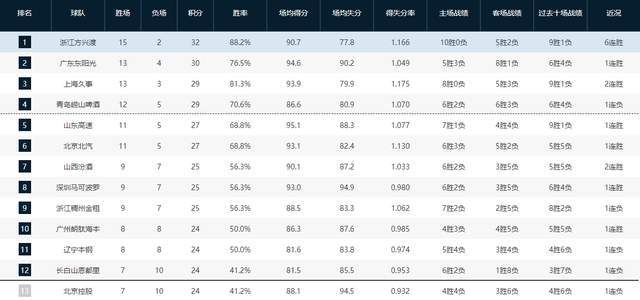 CBA最新排名!广厦第1太稳,广东超上海杀回第2,北控遭29分大败