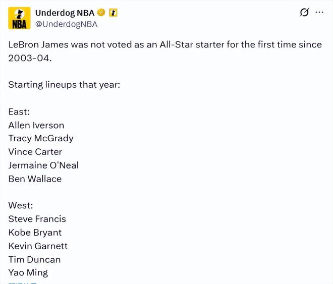 詹姆斯的新秀赛季效力于克利夫兰骑士队,彼时的东部全明星首发阵容由艾弗森、麦迪、卡特、本-华莱士与杰梅因-奥尼尔构成。西部全明星首发阵容为弗朗西斯、科比、加内特、蒂邓肯以及姚明,这份名单堪称星光熠熠。