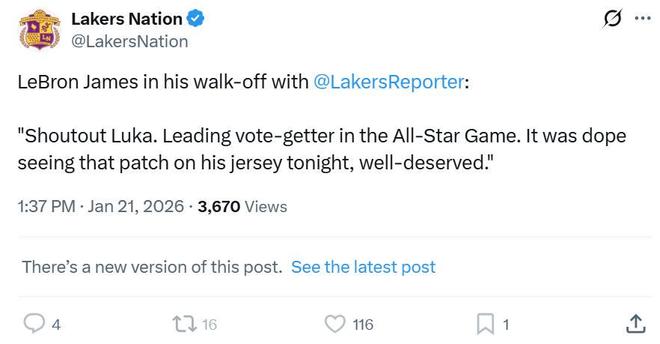 詹姆斯也在赛后送上祝福:“要向卢卡致敬,他是全明星票王,你能看到今晚他球衣上的徽章真的很酷,他当之无愧。”