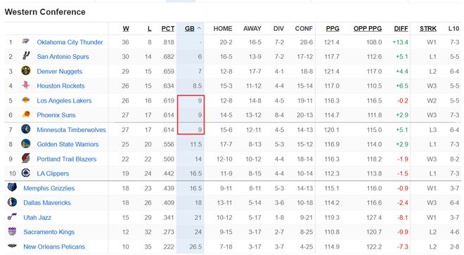 大家可以看到西部第五的湖人26胜16负、西部第六的太阳27胜17负 、西部第七的森林狼27胜17负,这三队的胜率几乎相同,所以西部大乱斗会延续下去。