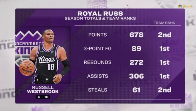 此役转播方还在比赛间隙晒出威少本赛季在国王的数据,得分678分第二、三分89个第一,篮板272个第一,助攻306次第一,抢断61个第二,就连官方都为37岁的威少点赞了。