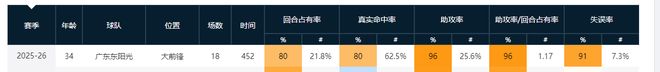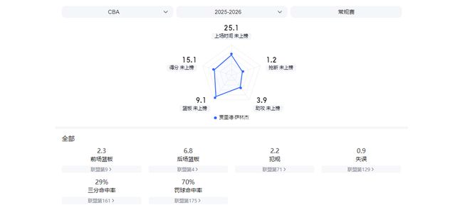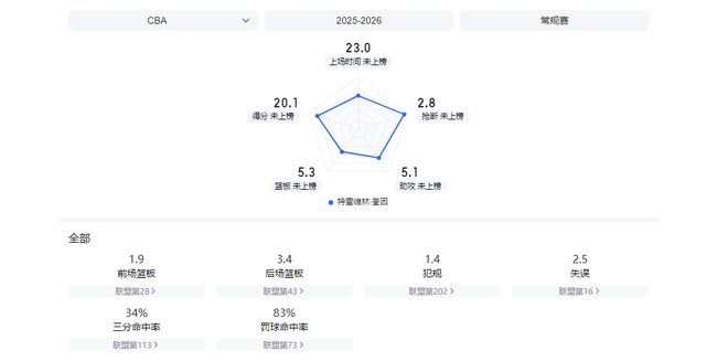 18次出场后,他场均15.1分9.1篮板3.9助攻,投篮命中率54.8%,三分命中率29.2%