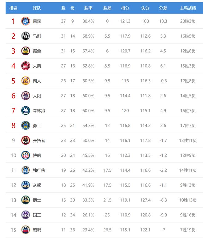 国王输球后12胜34负,继续排名西部第14。