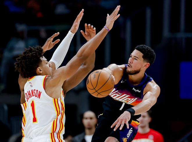 太阳客场挑战老鹰,太阳主力俱在,老鹰少了波津、里萨谢,太阳大将杰伦格林打了4分钟伤退,三节战罢太阳领先7分,布克在第三节末段崴脚退场,没有布克后太阳战力不足,老鹰第四节单节赢了14分,最终老鹰以7分优势击败太阳。约翰逊18中10得到23分18板9助,奥孔古15中9(三分5中3)得到25分5板5助2断,麦科勒姆15中9得到21分4板,太阳方面布克21中12(三分9中5)得到31分4板3助,阿伦12中7得到16分3板3助4断,吉莱斯皮12中6得到16分6板4助2断。