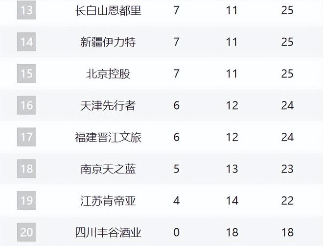 13-20分别是吉林、新疆、北控、天津、福建、同曦、江苏和四川。吉林两连败,他们的排名持续下滑。新疆两连胜,后续的赛程还不是很难,他们有希望继续提升战绩,毕竟攻守都回暖了,不排除第一阶段结束进入前12的可能性。北控两连败,刚爆发一场,又开始低迷了。天津和福建这轮都输球了,但他们落后前面三支球队就只差一场。同曦已经三连败,如果只是靠着郭昊文太难了。江苏最近开始起势了,最近10场获得3场比赛。至于四川,已经18连败了。