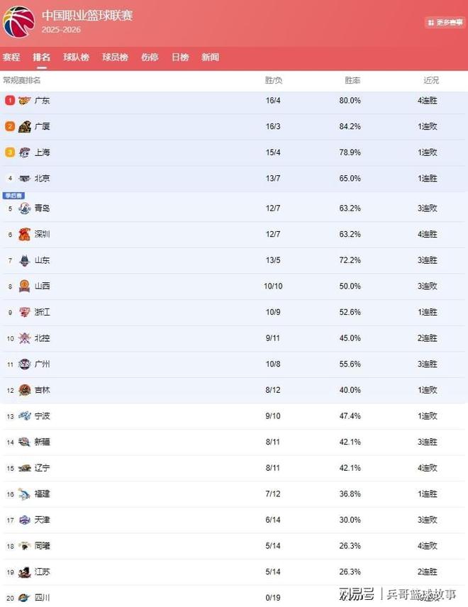 CBA最新排名!差距仅1场,3队抢第1;山东冲前4,辽宁跌出季后赛