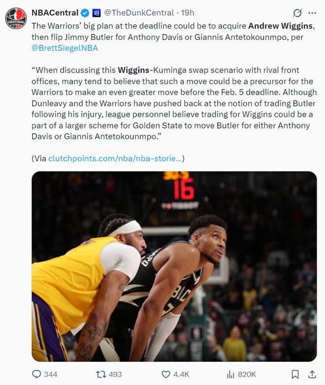 根据Brett Siegel的报道,勇士队目前正在推行一个宏大的交易方案,那就是先把夺冠功臣威金斯换回来,然后再用吉米-巴特勒的到期合同去换安东尼-戴维斯/扬尼斯-阿德托昆博。