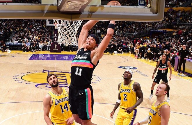 末节,克内克特抛投得分,奥利尼克上篮得分。蒂米三分命中,蒂耶罗扣篮2+1,蒂米又连得4分,把分差缩小到21分。约翰逊扣篮,麦克劳克林三分命中,奥利尼克上篮得分,麦克劳克林抢断得分,马刺回敬一波9-0。布朗尼三分命中,卡特-布莱恩特中投得分。布朗尼抛投命中,哈珀上篮得分。最终,马刺轻松击败湖人,拿下5连胜。