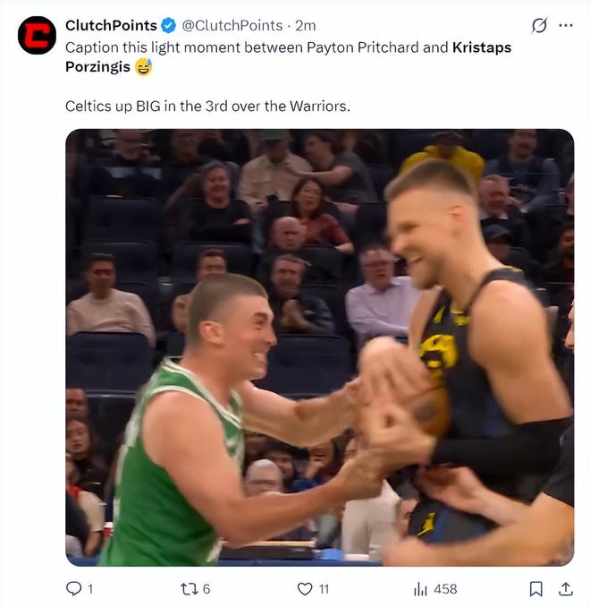 波尔津吉斯曾在23-24赛季跟随绿凯一同夺得NBA总冠军,随后被绿凯放弃,但他与队内很多球员都有着深厚的情感,赛前杰伦-布朗跟波尔津吉斯相谈甚欢,第二节波神获得登场机会,4中2+三分2中1拿到5分1篮板。