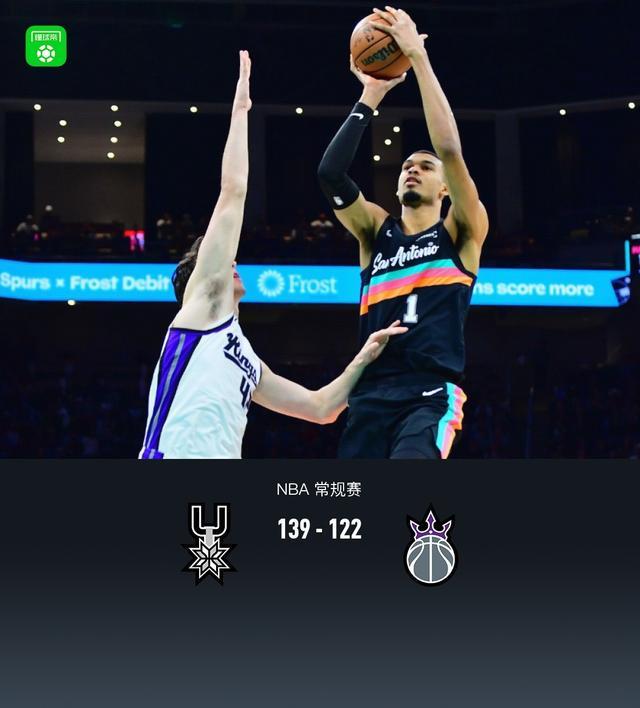 第四节马刺文班亚马拿下8分,国王迈克德莫特拿下8分,最终马刺139-122战胜国王
