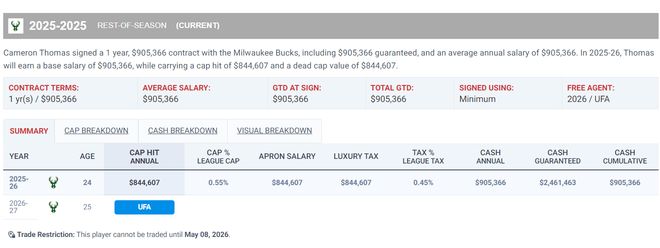 托马斯在被篮网裁掉后,他与雄鹿签下的是一份84万的底薪合同,火箭距离第二奢侈税征点还剩125万,按理说火箭也给得起,而且火箭队正好是14+3名单,火箭队没有追逐他肯定是因为乌度卡觉得他防守不行,可是火箭队本赛季最差的方面是进攻,关键时刻只能看杜兰特、申京两个点。