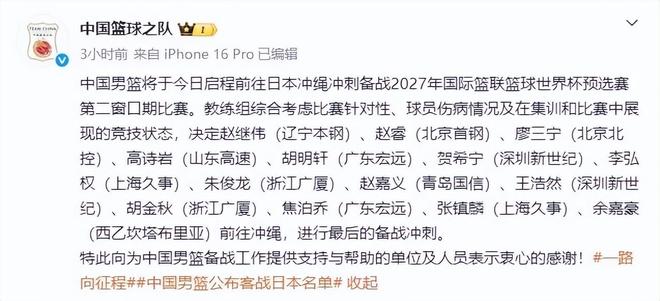 在CBA联赛的这个窗口期里,中国男篮要打两个世预赛客场比赛,对手分别是日本男篮和中国台北男篮。日前中国男篮已经飞往了日本冲绳,备战26日客场和日本男篮的比赛。中国男篮方面也进行了官宣,表示经过综合评估后,确定了出战这两场比赛的14人阵容,分别是:赵继伟、赵睿、廖三宁、高诗岩、胡明轩、贺希宁、李弘权、朱俊龙、赵嘉义、王浩然、胡金秋、焦泊乔、张镇麟、余嘉豪。余嘉豪会直接从西班牙飞往日本,和中国男篮会合。