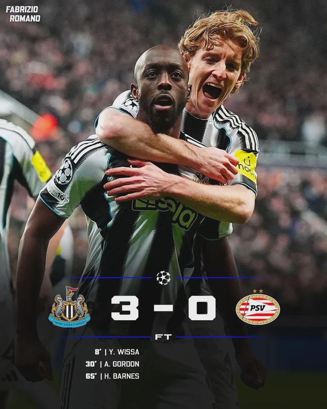 作为非传统BIG6球队参赛的纽卡斯尔,在本届欧冠的表现同样出色。他们在本轮欧冠主场3-0力克埃因霍温,前7轮比赛取得了4胜1平2负的战绩,暂居第7位。纽卡在小组赛客场1-2输给过马赛,主场1-2输给过巴萨,其余5场比赛保持不败。末轮欧冠比赛,纽卡将做客挑战巴黎圣日耳曼,他们想要保住前8席位,必须要击败欧冠卫冕冠军。对于艾迪豪而言,这是一项艰巨的任务。