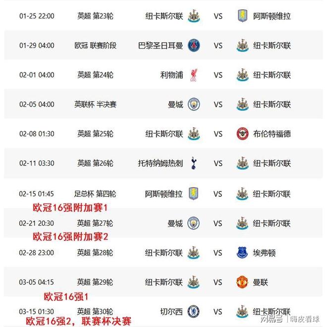 具体而言,纽卡斯尔本周迎战阿斯顿维拉,接着是巴黎圣日耳曼和利物浦,曼城和布伦特福德,随后是热刺和阿斯顿维拉,曼城和埃弗顿,最后还有曼联和切尔西,11场比赛,9遇强大对手,涵盖了英超、欧冠、联赛杯和足总杯四大赛场,不仅包括欧洲卫冕冠军巴黎,还两次遇上维拉,两次遇上曼城,其中只有布伦特福德和埃弗顿,也许实力较弱一些。