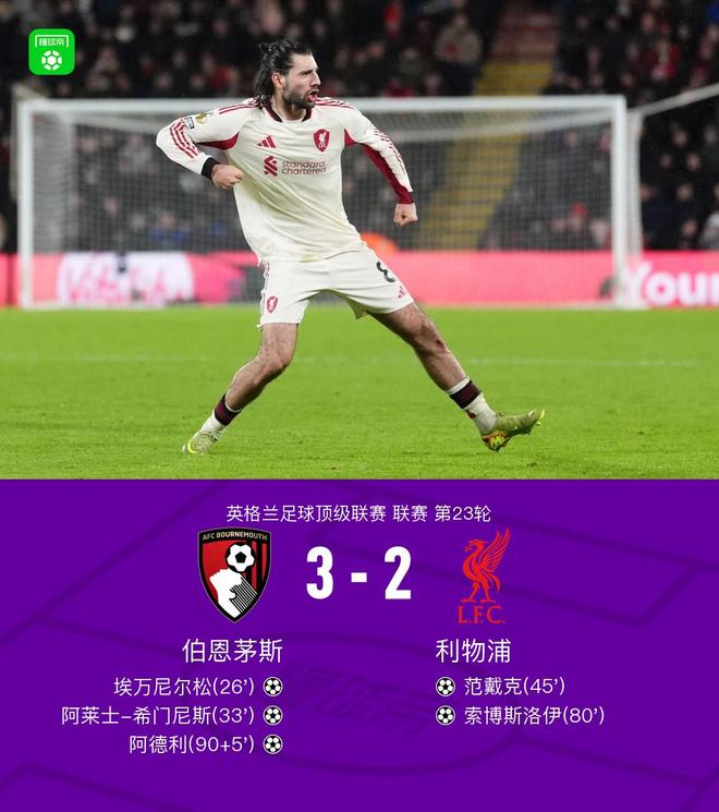 北京时间1月25日,英格兰足球超级联赛第23轮,伯恩茅斯主场对阵利物浦。埃万尼尔松率先破门,阿莱士-希门尼斯随后扩大比分;范戴克为利物浦扳回一城;索博斯洛伊攻入关键进球,将比分再度追平;比赛尾声阶段,阿德利打入制胜一球。最终伯恩茅斯3–2战胜利物浦。